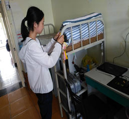 为了能够更好的提高男生们打扫寝室的积极性,彻底的改变寝室里脏、乱、差的现状,公司以年级为单位成立了四支女生评审团,由辅导员带队,对男生寝室进行逐一评审打分。评分表由地面卫生、物品摆放、床铺整洁、寝室文化等几项内容组成,如果安排专人讲解还有加分。每层楼依照打分的高低评出3个最优寝室,由评审团的女生们为该寝室赠送装有艾草的香囊。