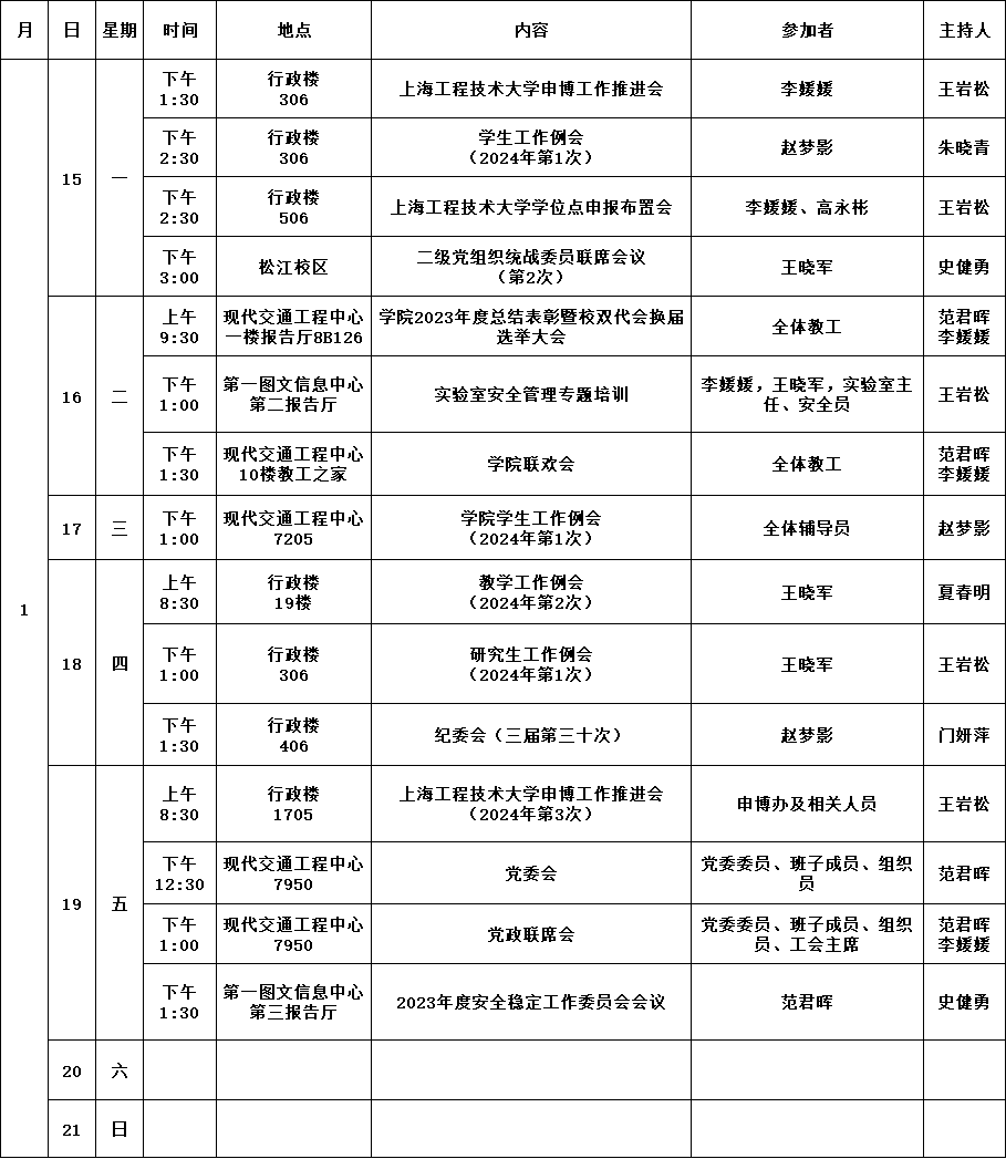 公司第19周活动安排(2024年1月15日-2024年1月21日)