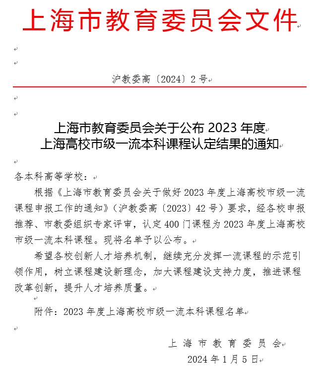 根据《上海市教育委员会关于公布2023年度上海高校市级一流本科课程认定结果的通知》(沪教委高〔2024〕2号)