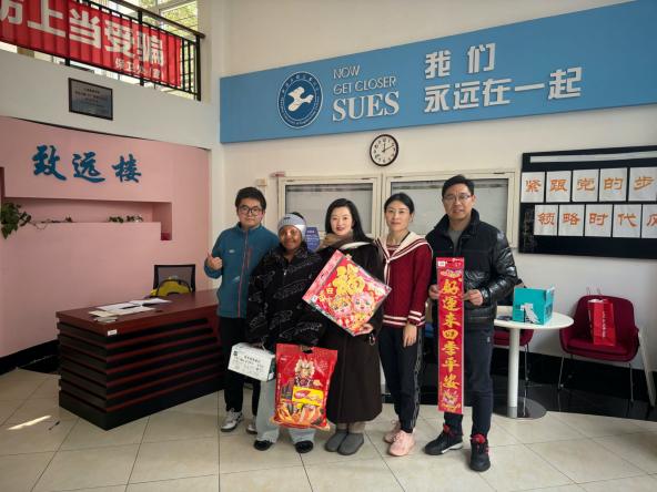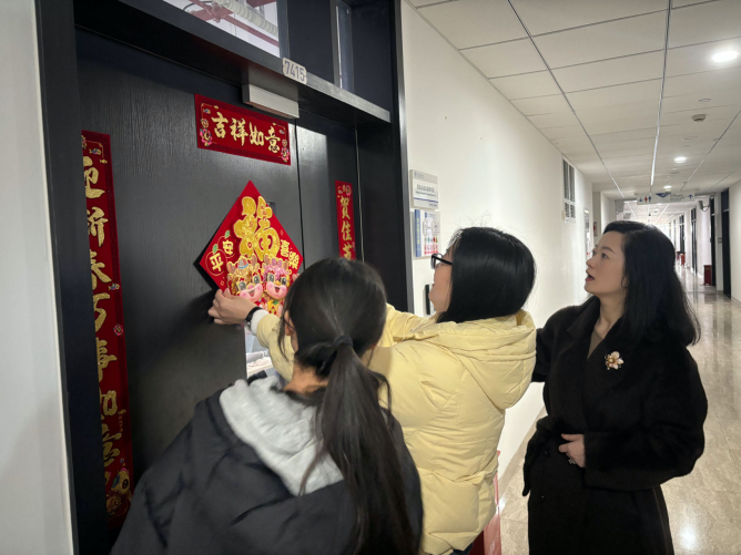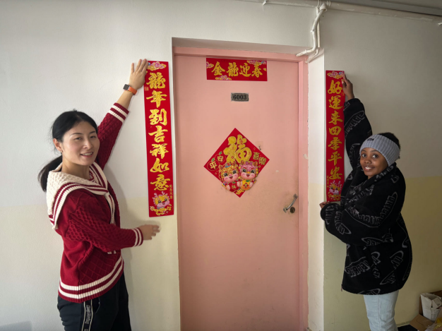 赵梦影老师与辅导员们还一同走访了宿舍园区,慰问留校员工。走访过程中,聚焦冬季安全防范要求,对寒假期间员工宿舍生活用电安全进行了排查和安全知识宣讲,希望同学们在校园里过个平安年。在职工宿舍里,与同学们一起贴中国传统的春联和窗花。来自各国的职工们还向大家讲述了自己国家当地的新年文化,其乐融融。在困难生宿舍里,赵梦影副书记代表公司向同学们表达了新春的美好祝愿,勉励大家在新的一年里取得更大的进步和成就。她强调,公司将一如既往地关心关爱每一位员工,为大家提供更好的学习和生活环境,共同创造更加美好的未来。最后,送上了公司的春节慰问大礼包和新一年的美好祝愿。