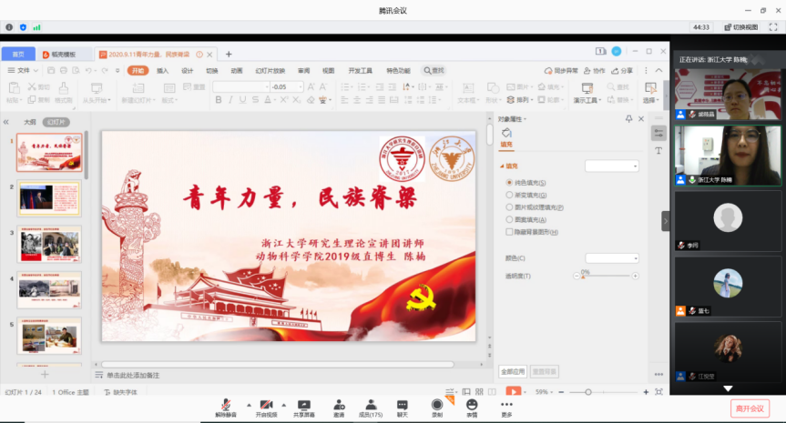 为深入学习贯彻落实习近平新时代中国特色社会主义思想,全面落实立德树人根本目标,深化“三全育人”工作,扎实推进“四史”教育和开学主题教育,引导员工坚定理想信念、涵养家国情怀、砥砺奋斗精神,激发员工的爱国之情和报国之志,3044永利集团于9月11日下午举行了“开学第一课,爱国进行时”主题教育活动。本次活动采用线上线下相结合的形式,由公司副书记熊筱晶主持,邀请了公司党委书记段海霞、浙江大学研究生理论宣讲团副团长陈楠、公司讲师团宣讲之星江悦莹分别作主题报告,参加本次活动的还有公司组织员苏莹、全体辅导员及部分员工代表。