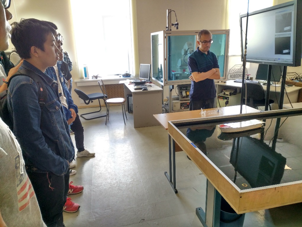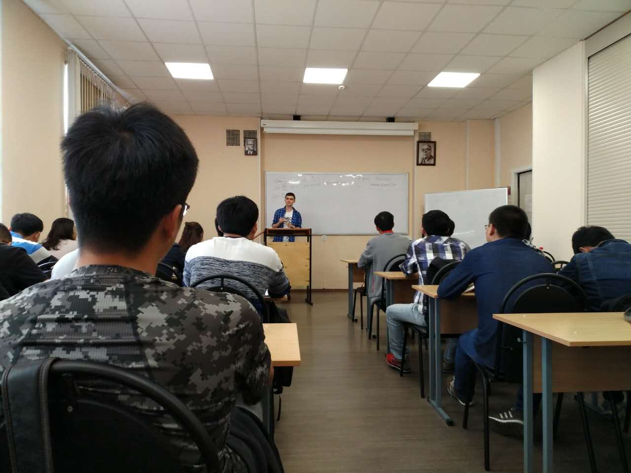 下面介绍的是Aleksandr Kapitonov教授上的课程,主题是机器人的控制与编程。首先,Aleksandr Kapitonov教授讲授了移动机器人及其控制方面的相关理论,从移动机器人的机械结构、驱动方式到控制方式——PID控制。在讲课过程中还不时的展示实际的机器人,使大家不仅在理论上接受了前人的认知,也从实践出发,根据自己的感官建立了属于自己的认知,这两种认知的结合给大家留下了深刻的印象。