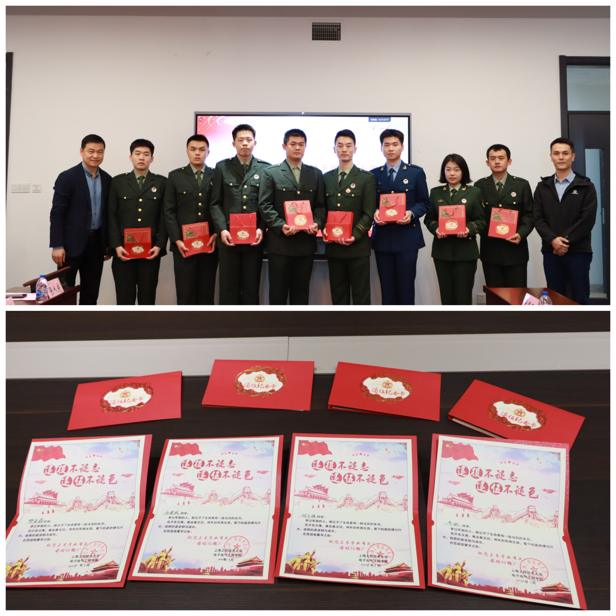 最后,公司党委研究生工作部副部长王东阳、校武装部专武干部陈磊为退伍员工颁发退伍纪念卡,赠予退伍纪念品。