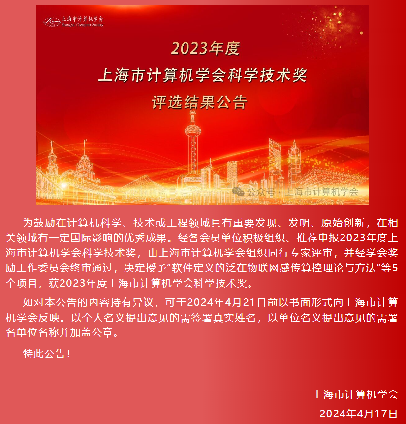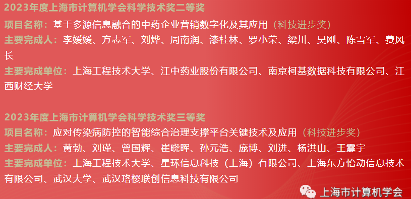 近日,上海市计算机学会组织同行专家评审,并经学会奖励工作委员会终审通过,发布科学技术奖评选结果公告。2023年度上海市计算机学会科学技术奖获奖项目共有5项,分别是自然科学奖2项、技术发明奖1项、科技进步奖2项。公司作为第一完成单位此次获得上海市计算机学会科技进步二、三等奖。
