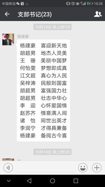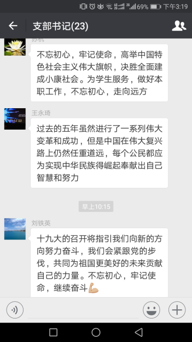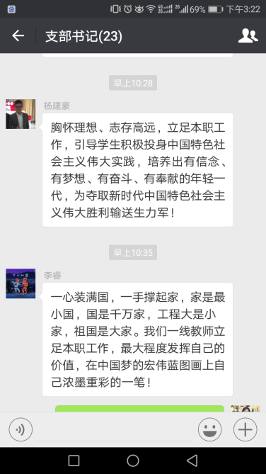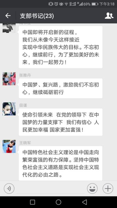 支部书记热烈讨论抒发自己的真实情感。公司支部书记在听报告的过程中,深受感动,大家情不自禁地就在群里展开了讨论。员工第二党支部书记杨建豪表示要胸怀理想、志存高远,立足本职工作,引导员工积极投身中国特色社会主义伟大实践,培养出有信念、有梦想、有奋斗、有奉献的年轻一代,为夺取新时代中国特色社会主义伟大胜利输送生力军。员工第三党支部书记刘铁迎表示会和大家一起紧跟党的步伐,共同为祖国更美好的未来贡献自己的力量。不忘初心,牢记使命,继续奋斗。研究生第一支部书记苏莹祝愿伟大的祖国更加繁荣昌盛,并表示将继续立足本职工作,以实际行动为建设祖国添砖加瓦。研究生第二支部书记张雅丹说中国梦和复兴路激励着大家不忘初心,继续砥砺前行。电气工程党支部书记闫书佳表示将不忘初心,继续前行,为了更加美好的未来,和大家一起努力!计算机系党支部书记苏前敏表示要不忘初心,牢记使命,高举中国特色社会主义伟大旗帜,决胜全面建成小康社会。为员工服务,做好本职工作,不忘初心,走向远方。电子信息系党支部书记王永琦认为每个公民都应为实现中华民族得崛起奉献出自己智慧和努力。中心实验室党支部书记李睿认为一心装满国,一手撑起家,家是最小国,国是千万家,工程大是小家,祖国是大家。一线教师应该立足本职工作,最大程度发挥自己的价值,在中国梦的宏伟蓝图画上自己浓墨重彩的一笔!李睿的精彩发言获得了大家的点赞表扬。