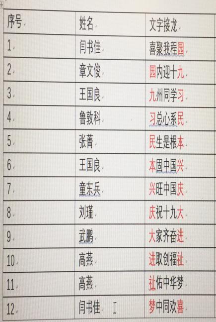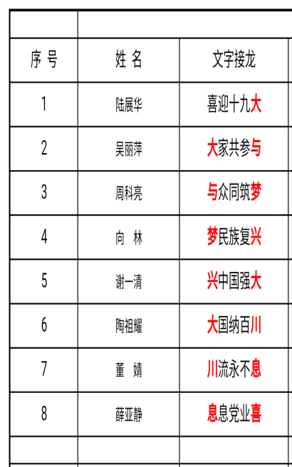 党员说心里话庆祝十九大顺利召开。公司师生党员在开幕式召开期间,大家在群里纷纷说出自己的心里话。支部成员们大多用短句表达出对十九大召开的感想,抒发各自心声。细心的支部书记们把大家的发言进行了适当的整理,就出现了首尾相连的文字,其中每一句的第一个字和前一句的最后一个字相同。随后大家踊跃参加,一时间才思泉涌,写出来的句子受到了公司党员们的好评。