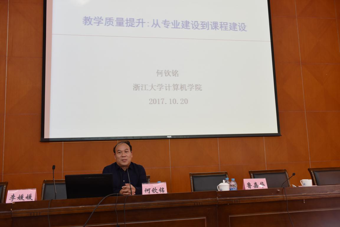 原浙江大学计算机公司党委书记何钦铭教授应邀作主题为“教学质量提升:从专业建设到课程建设”的报告。何教授以计算机公司的教学质量工程项目引出工程型、复合型、国际化的人才培养整体思路,通过国家级教学成果奖的申报内容提出专业建设的要点,同时通过高级数据结构与算法设计、高级语言程序设计两门课程解释如何提升课程建设质量,最后他分析了科研对教学的作用和贡献。何教授的报告深入浅出、引人入胜,引得大家报以阵阵掌声。