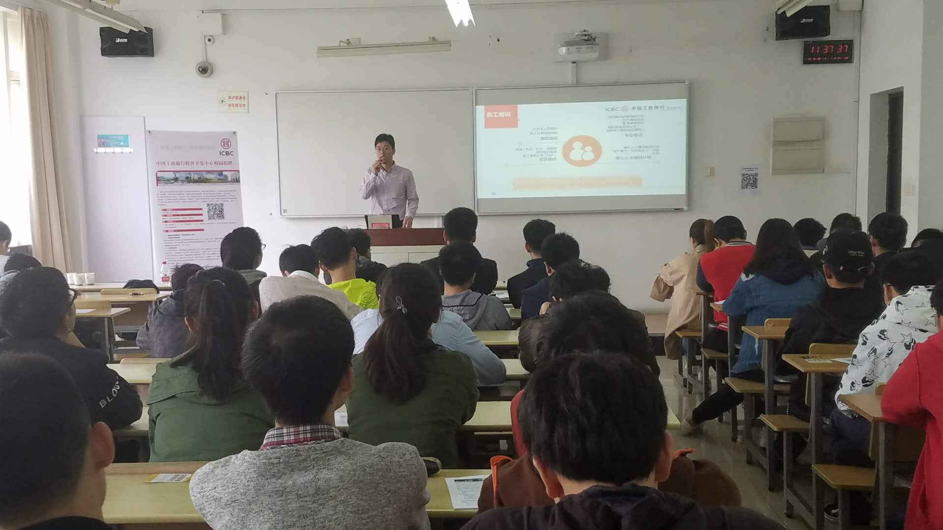 20171018日中午1100,在教学楼A306举行了中国工商银行软件开发中心的二级市场宣讲会,公司毕业本科生研究生参加了此次宣讲会。中国工商银行软件开发中心(上海研发部)的王总通过播放宣传片、PPT展示、面对面交流等方式向同学们介绍公司的概况、职业发展方向、人员需求以及选择该单位的理由等,此次招聘的岗位主要为软件开发、软件测试、大数据、人工智能等领域研究、研发等,王总表示公司非常欢迎广大相关专业的同学踊跃报名应聘,同学们之后积极的投递了简历。