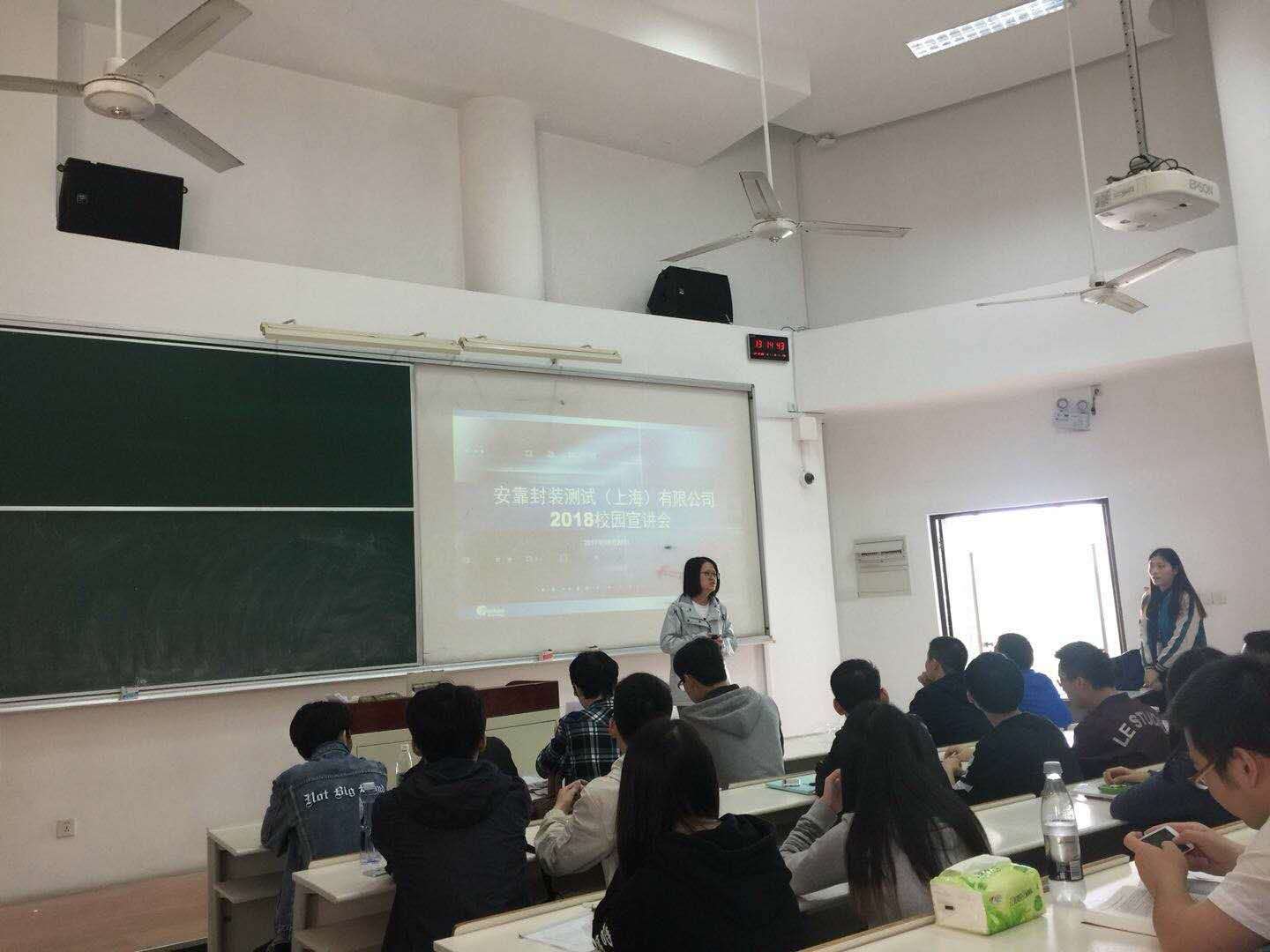 2017年10月20日下午13:00—16:30,在教学楼J301举行了安靠封装测试(上海)有限公司的二级市场宣讲会,公司毕业本科生研究生参加了此次宣讲会。公司人力资源部的周老师通过播放宣传片、PPT展示、面对面交流等方式向同学们介绍公司的概况、职业发展方向、人员需求以及选择该单位的理由等,此次招聘的岗位主要为工艺工程师、设备工程师、测试产品工程师等,人力资源部的周老师表示公司非常欢迎广大相关专业的同学踊跃报名应聘,同学们之后积极的投递了简历。