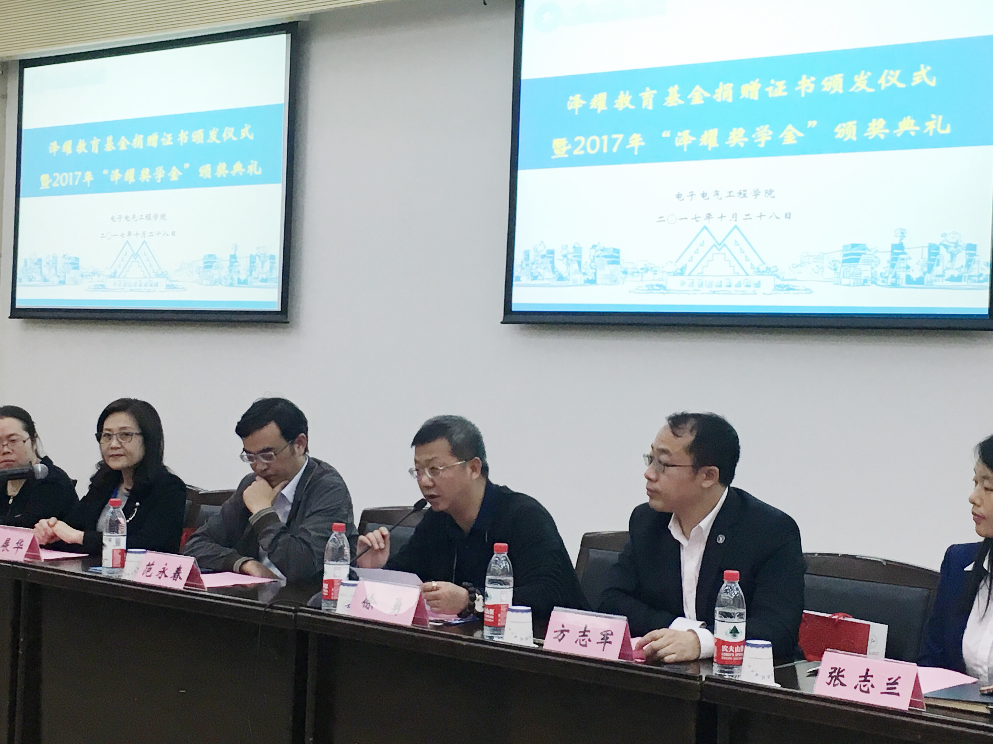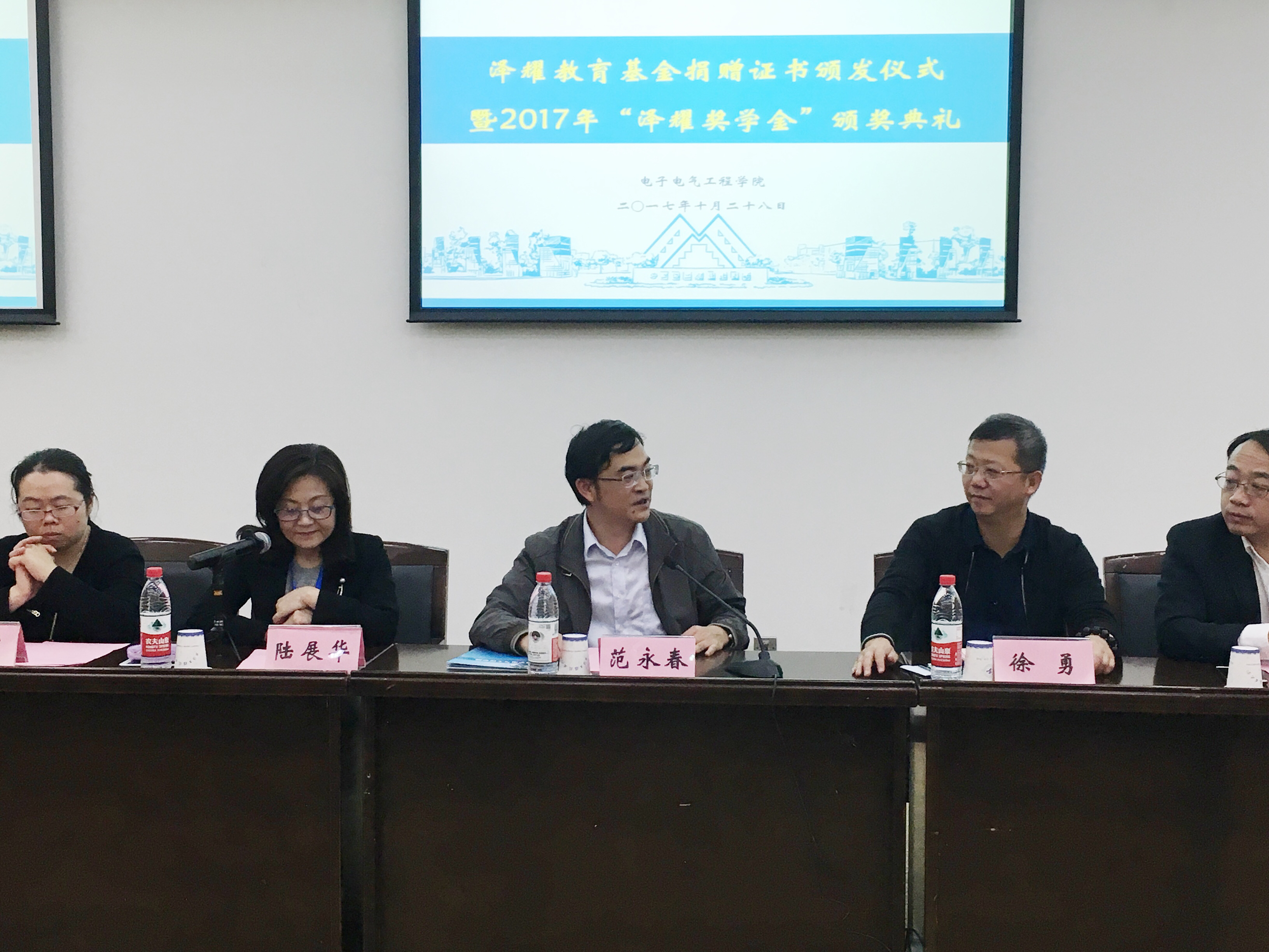 10月28日,公司建校39周年员工返校日下午,3044永利集团在图文信息中心第三报告厅隆重举行2017年泽耀教育基金捐赠证书颁发仪式暨泽耀奖学金颁奖典礼。上海泽耀环保科技有限公司董事长徐勇、上海泽耀环保科技有限公司总经理张志兰,公司党委副书记范永春,公司党委书记陆展华、经理方志军、副书记秦颖、副经理李媛媛、副经理刘瑾出席了颁奖典礼。公司员工工作办公室全体辅导员、员工代表和获奖同学参加了颁奖仪式,颁奖仪式由公司党委书记陆展华主持。