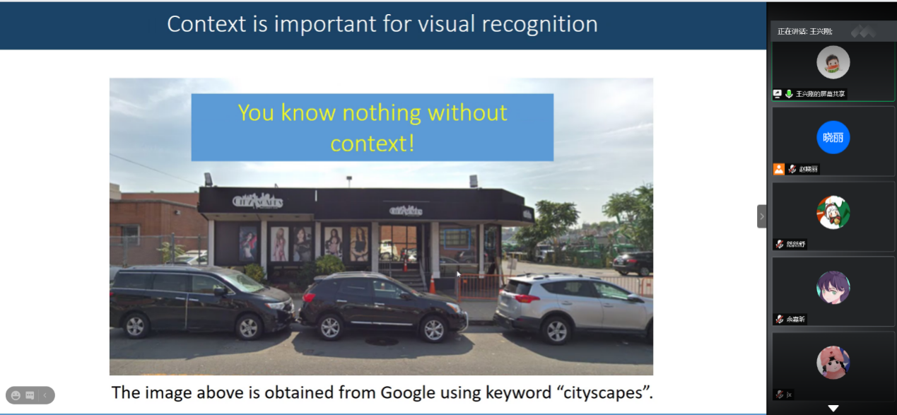 王兴刚老师首先介绍了深度物体分割概念及相关应用,然后分享了上下文特征建模、边缘特征建模在视觉识别研究中的最新研究文献,最后详细介绍了其课题组提出的CCNet和BMask R-CNN方法在上下文和边缘特征建模中取得的成果。报告结束后,线上师生与王教授做了进一步交流。