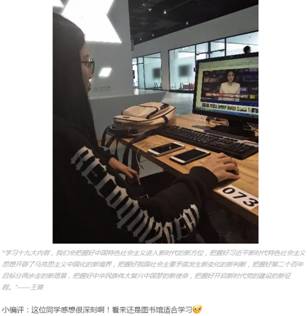 支部党员密切关注十九大的召开,一部分同志在寝室观看,在自己追求思想进步的同时,带动寝室其他同学一起学习十九大精神、关注国家时事;一部分同志在教室组织班级同学一起学习十九大重要内容,将“关注十九大”再次引入一个高潮;另一部分同志在图书馆查询资料,更加深度的关注学习十九大精神。并且在学习之后,大家积极参与“晒一晒”活动,将自己的感想上传,与其他不同地区、不同职业的人进行思想交流。其中,我支部王爽同志上传的留言被编辑人员选中发布在上海教卫党建公众号的文章中。