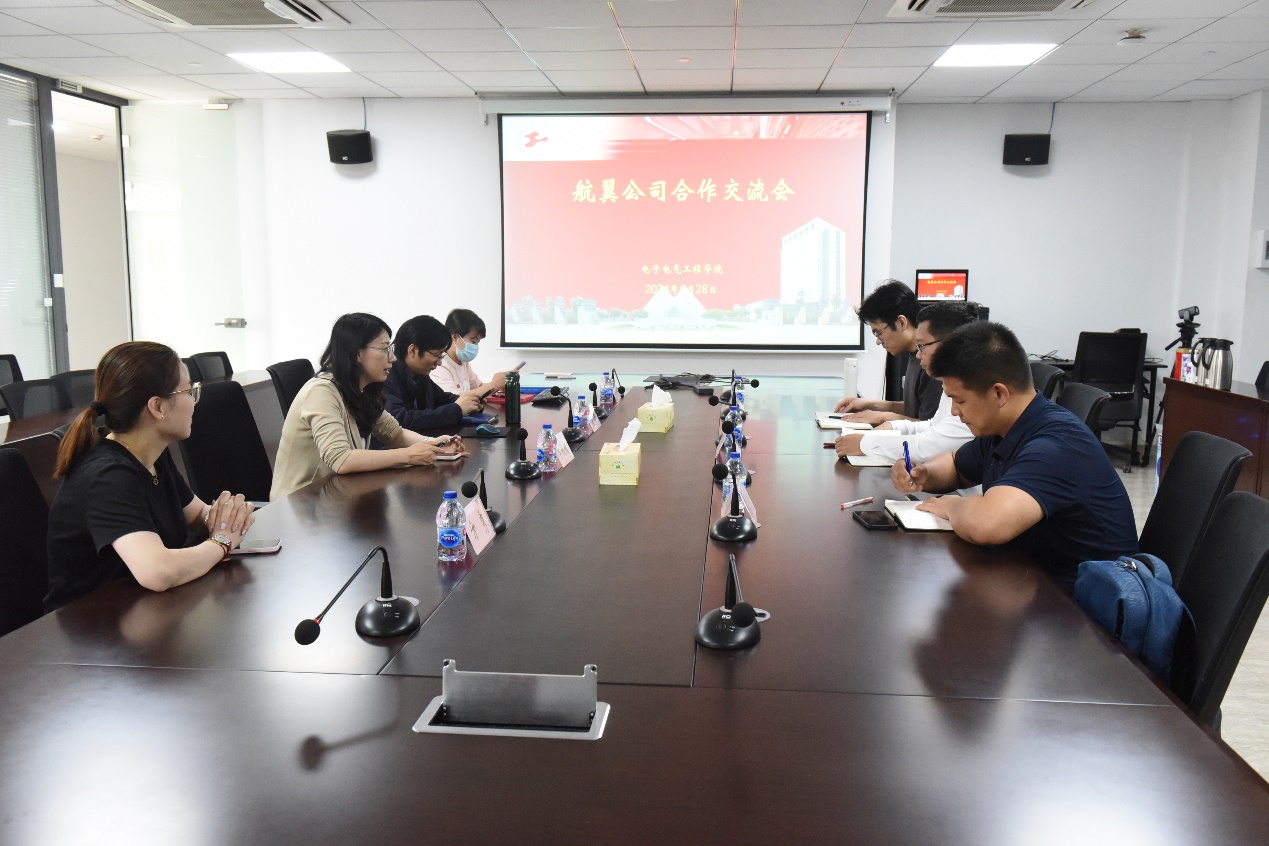 会议交流环节,电气公司经理李媛媛,副经理高永彬,自动化系主任阚秀参加了座谈交流。副经理高永彬介绍了公司的办学整体情况,包括党建工作、团队建设、员工培养、科教融合及在深化产教融合、校企合作方面取得的成绩。航翼公司介绍了公司的基本情况和相关案例,并提出了相关的合作需求。双方就未来的合作方向和合作内容进行了深入的交流,并初步达成了合作共识。