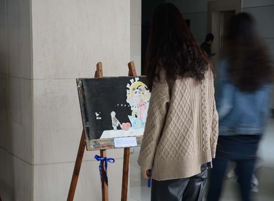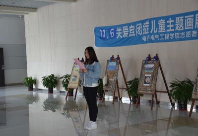此次画展在图书馆举行,时间为10:00-20:00。12幅校内征集作品,47幅自闭症儿童画作。孩子们稚嫩的笔尖下是他们孤独的心灵世界,校内同学流畅的线条下则是声声召唤,召唤我们关注这样一群将自己放在阴暗中的小天使。展架前有同学的驻足观看,也有志愿者的声声解说与微笑。志愿者为同学们绑上爱的蓝丝带,将爱心传递下去。