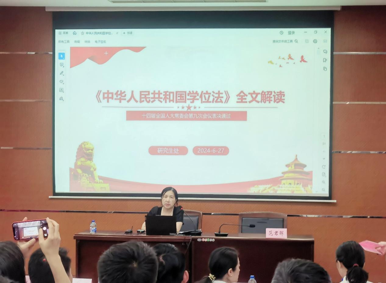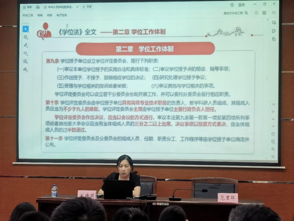 赵经理详细阐述了《中华人民共和国学位法》的六大主要部分,包括总则、学位体制、授予资格、授予条件、授予程序以及质量保障等方面。她首先对总则进行了概述,强调了学位法的立法宗旨、适用范围以及基本原则,为接下来的详细解读奠定了基础。