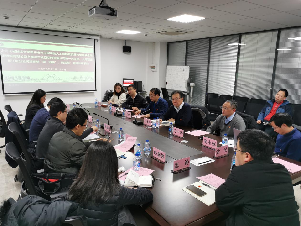 为深入贯彻落实习近平新时代中国特色社会主义思想,落实基层党组织开展“四史”教育,2020年12月23日,公司人工智能党支部与中国联通上海市产业互联网有限公司第一党支部、上海联通松江区分公司党支部“学‘四史’、促发展”联建共建活动。