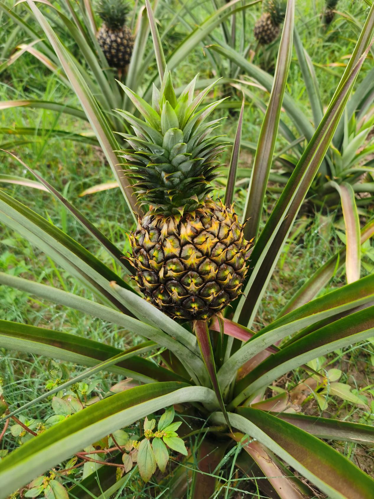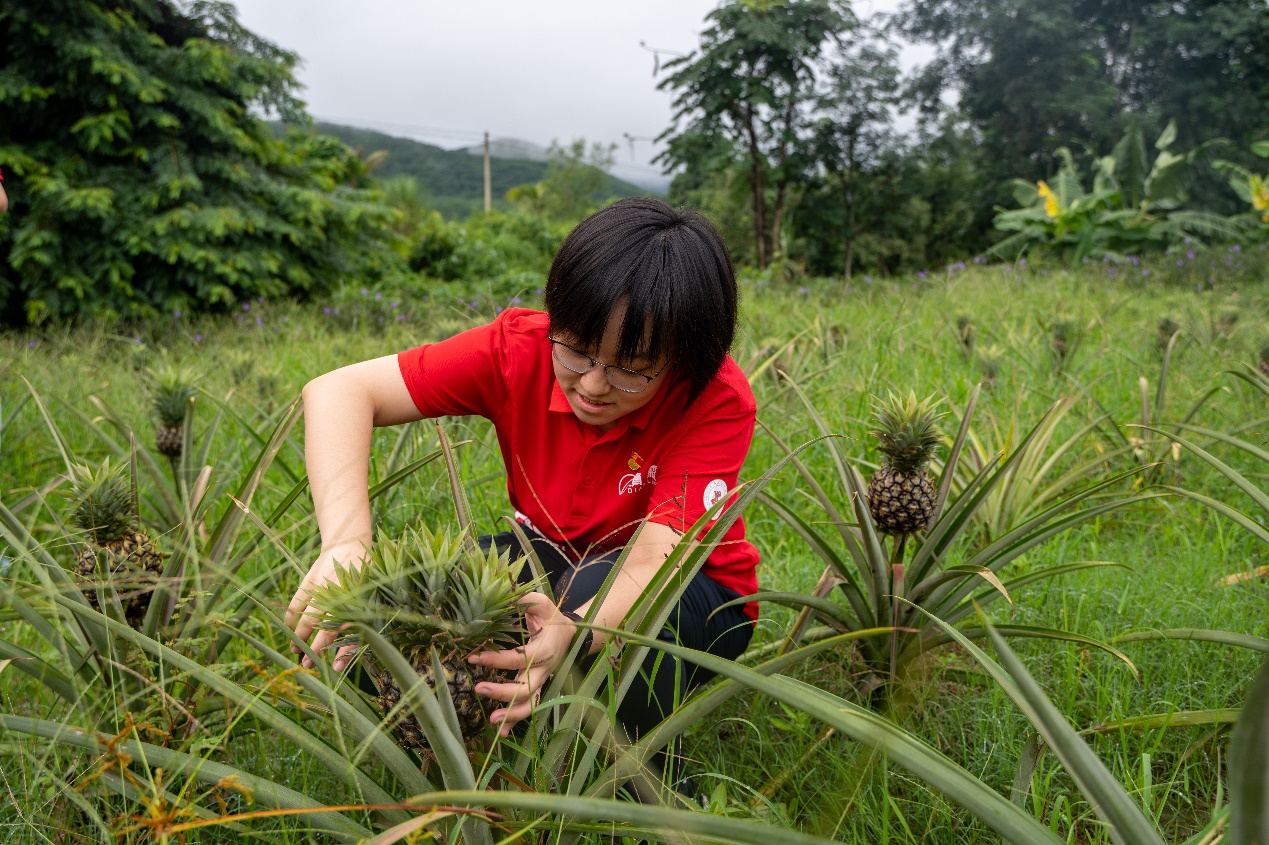 考察中,他们发现橡胶树每30年就换新苗,而生长到第8年才能割胶,也就是说前7年农民无直接农业收入来源,这一定程度上影响到了脱贫的步伐。通过邀请热科院专家对云南得天独厚的地理环境、种植条件等多方因素调研后,发现橡胶与菠萝可在不同深度的土层共生,因此发展“林下经济”,采用橡胶与菠萝交叉种植的方式,填补了农民前7年的收入空白。当地种植的菠萝果肉,甜度高达20.8,远超平均水平,具有极高的食用价值;将菠萝一体化应用在当地,回收种苗,菠萝叶渣可以作为饲料或者经过处理成为绿色污染化肥,而菠萝叶经过技术提取,可以作为新型纺织材料。也就是说,菠萝一身都是宝。