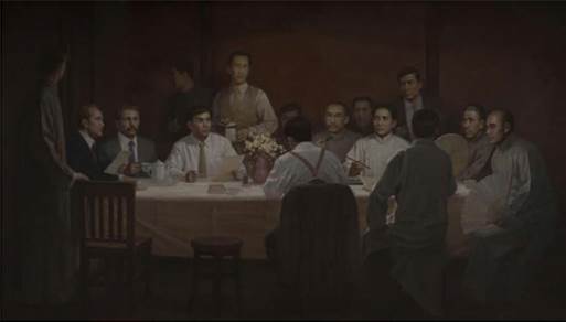 这幅是画家为上海历史文脉美术历史创作工程所作的油画,再现1921年7月中国共产党在上海召开第一次代表大会时的历史一刻。