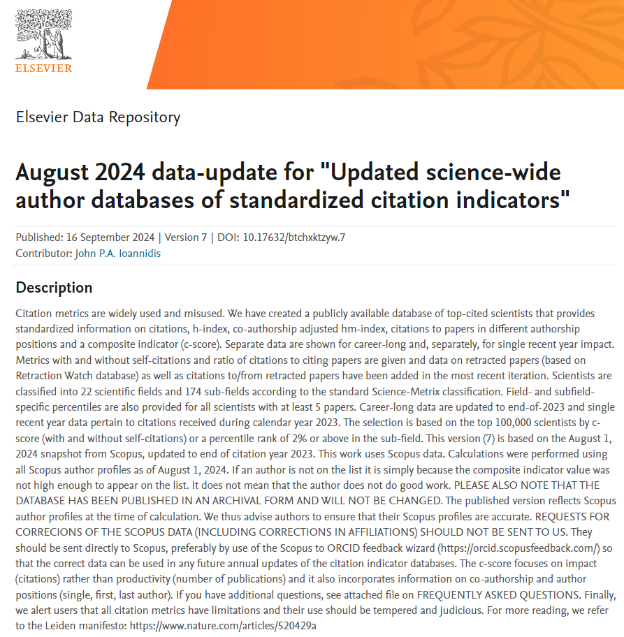 美国斯坦福大学的John Ioannidis教授团队新近在爱思维尔(Elsevier)出版集团官网上发布了2024年全球各学科前2%科学家榜单(第七版),通过统计每个科学家发表的论文数及其引用次数,采用6种指标建模进行综合评分,遴选出217098名科学家,大致涵盖了各学科排名前2%的科学家。中国大陆有10687名科学家入选,占4.92%。公司共有16位学者入选年度榜单,8位学者入选终身榜单。