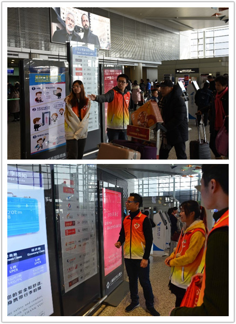 志愿者们每天都会早早地来到虹桥机场,9点准时开始志愿服务,每小时轮岗一次。主要工作是为旅客提供引导咨询、购票指引、安全检查、验票、搬运行李、秩序维护、重点帮扶、应急救援等志愿服务,受到机场和旅客的一致好评。