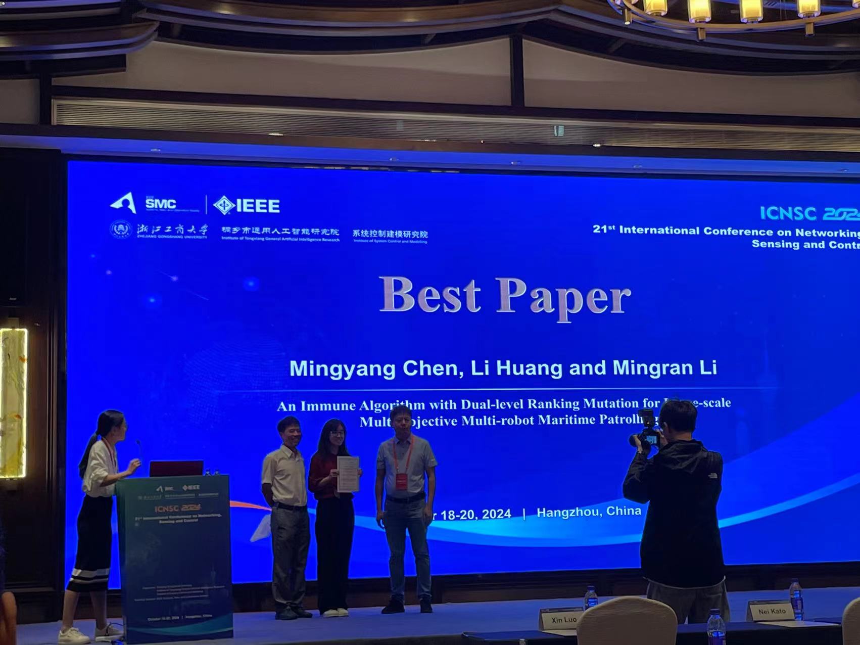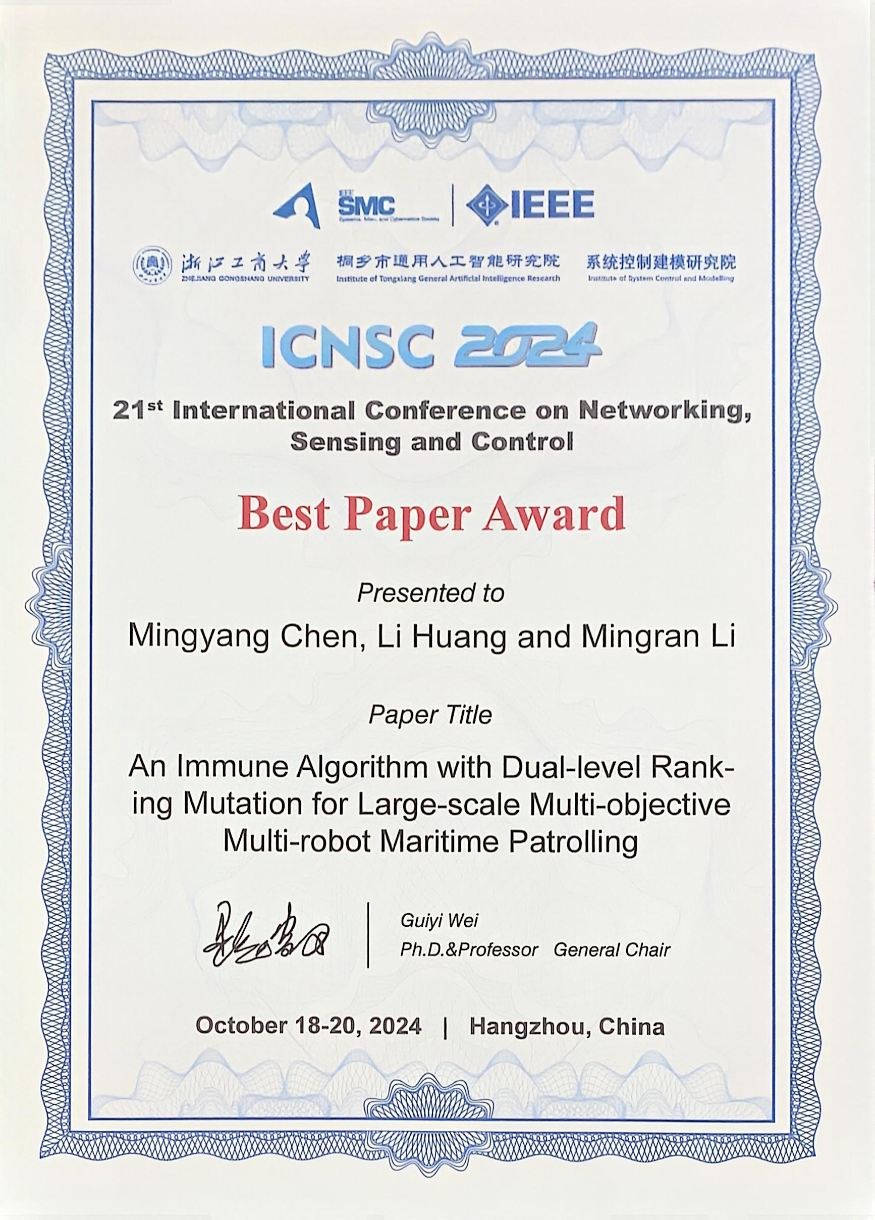 2024年10月18日至10月20日,第21届IEEE网络、传感与控制国际会议(IEEE ICNSC 2024,21st IEEE International Conference on Networking, Sensing and Control)在杭州召开。电子信息系黄丽老师指导的21级人工智能专业本科生陈铭洋获得了大会唯一的最佳论文奖(Best Paper Award)