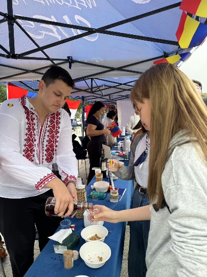 随后,“国家文化风情展”为大家将更多国际文化带到我们身边,展台上齐聚来自蒙古、孟加拉、巴基斯坦、也门、俄罗斯、罗马尼亚、摩洛哥、加纳、津巴布韦和利比里亚等国的手工艺品和风味特色,国际员工们身着各国特色服装,在展台前载歌载舞、放声歌唱。程园师生亦被吸引过来,了解各国风情,品尝各地美食,感受友谊与和平,探寻共同的声音。