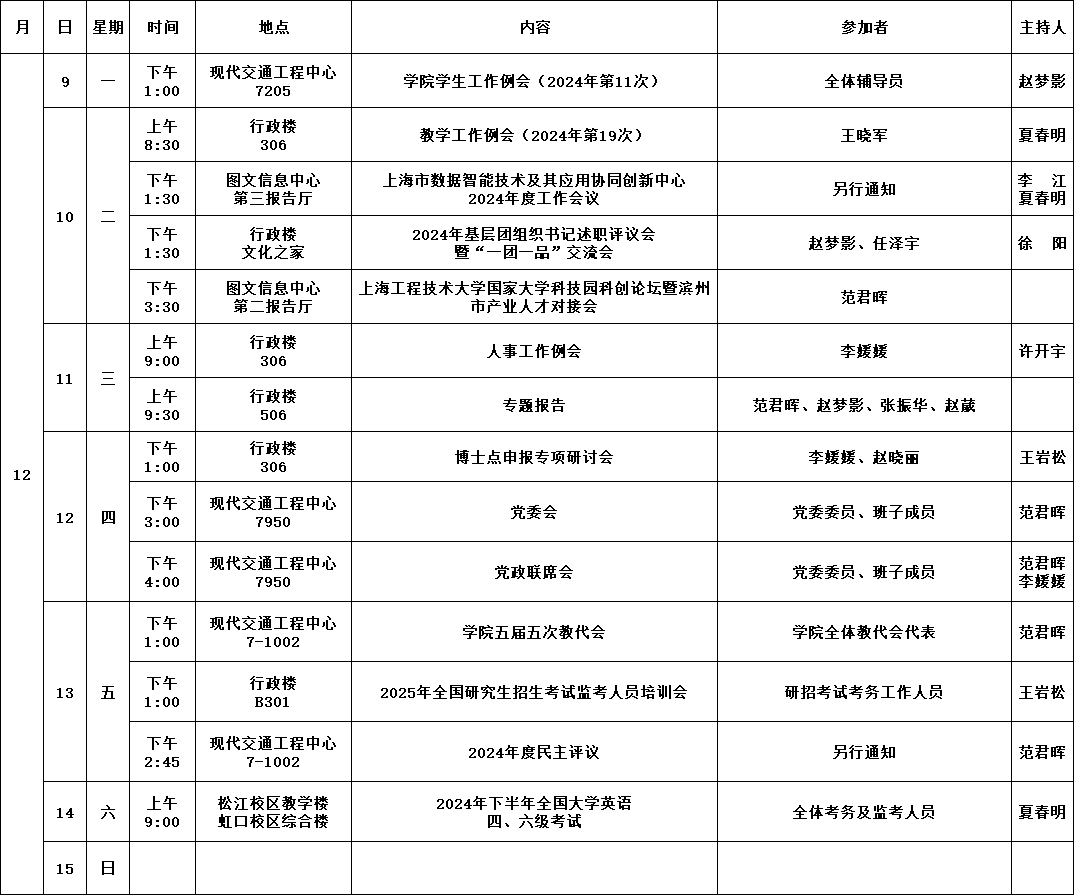 公司第15周活动安排(2024年12月9日-2024年12月15日)
