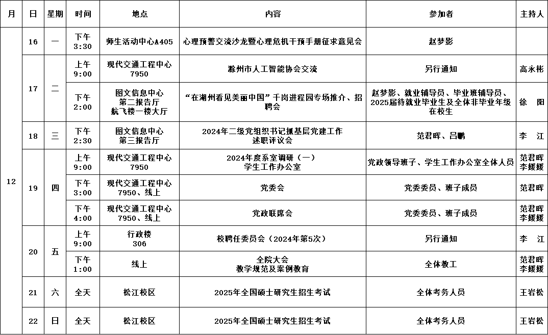公司第16周活动安排(2024年12月16日-2024年12月22日)