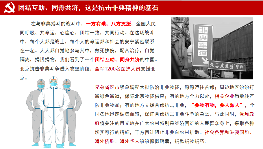 抗击非典精神的基石:团结互助、同舟共济。在与非典搏斗的战斗中,一方有难,八方支援,全国人民同呼吸、共命运,心连心,团结一致,共同行动。在这场战斗中,每个人都是战士,每个人的命运都和社会的安宁紧密联系在一起。人人都自觉地参与其中,救死扶伤,配合治疗,自觉隔离,捐钱捐物,我们看到了一个团结互助、同舟共济的中国。