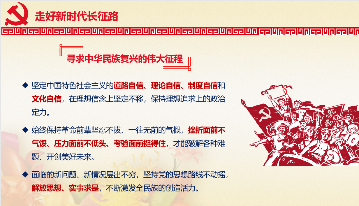 闫老师以“长征的起因-长征的过程-长征的影响”为主线,图文并茂地讲述、阐释了长征精神的五个方面:①把全国人民和中华民族的根本利益看得高于一切,坚定革命的理想和信念,坚信正义事业必然胜利的精神;②为了救国救民,不怕任何艰难险阻,不惜付出一切牺牲的精神;③坚持独立自主、实事求是,一切从实际出发的精神;④顾全大局、严守纪律、紧密团结的精神;⑤紧紧依靠人民群众,同人民群众生死相依、患难与共、艰苦奋斗的精神。