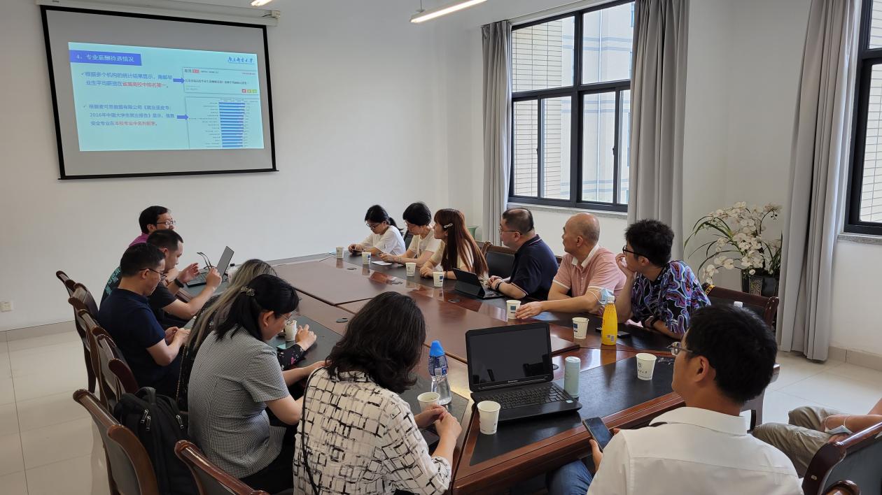 南京邮电大学的两位老师通过详实的PPT和接地气的语言,向我系老师分享了一流本科专业的建设经验,包括:1.举办面向本科生和研究生的夏令营等活动,以吸引优秀生源,提升专业知名度;2.在职称聘任时综合考虑科研、教学和竞赛等各方面的成果,鼓励教师积极带领员工参加网络安全相关的竞赛并力争获奖;3.每一门专业课都设有配套的实践教学环节,以提升员工的动手能力;4.提升竞赛参与与获奖人数、知名单位的就业率和老员工省市级以上的优秀论文数量。
