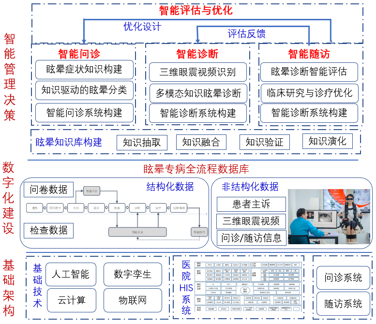该项目拟建立眩晕专病的全流程数字化诊疗平台,旨在通过数字化建设的手段,实时高效地采集眩晕患者的入院前的问诊数据、院内的全方位检查数据、以及出院后的随访数据全流程专病数据库;基于全流程数字化诊疗平台,构建多模态融合的眩晕辅助诊断模型,通过视频三维眼震、患者主诉以及院内检测数据、入院前的问诊信息等多模态数据特征提取与融合,实现眩晕的精准辅助诊断;融合患者出院后的随访数据,提升辅助诊断的准确性,优化患者入院前的问诊系统设计,实现患者的个性化诊治。