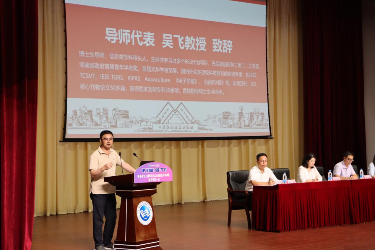 公司党委副书记赵梦影介绍2025级研究生分班及班主任情况。她指出,班主任将协同硕导、辅导员、研究生秘书等共同为研究生成长搭建多维育人模式,为研究生提供全方位的支持与帮助。吴飞教授代表硕导发言。作为深耕教学科研一线多年的资深导师,吴飞教授以“学术路上的同行者”身份,与新生们分享心得。吴飞教授的话语质朴而真诚,既传递了学术传承的温度,也为新生们快速适应研究生生活提供了实用指引。