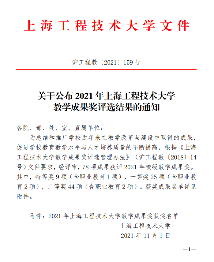 自动化专业创新型多维分层工程应用型 人才培养探索与实践 | 王晓军,游晓明,王宇嘉,奚峥皓,苏晓宇, 曹乐,王娆芬,徐冬梅,凌铭 | 二等奖 |