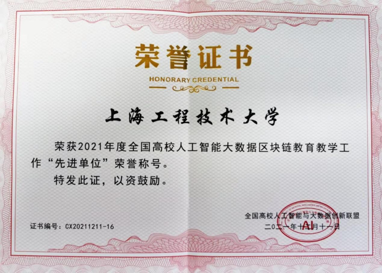公司荣获2021年度全国高校人工智能与大数据区块链公司产品工作“先进单位”荣誉称号。