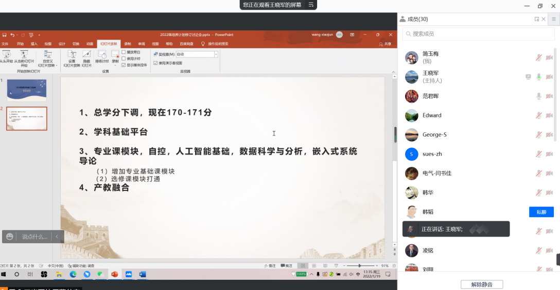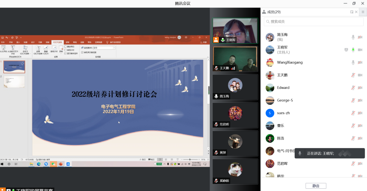 2022年1月19日,公司在腾讯会议上召开2022级培养计划修订讨论会。教务处陈浩处长、公司党委书记范君晖、上海交通大学电子信息与电气工程公司韩韬副经理、校企合作企业专家以及公司各系室负责人参加了会议,会议由公司副经理王晓军主持。