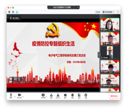 公司党委书记范君晖强调:一是作为一名党员同志,要深刻认识当前疫情防控的严峻形势,更要认识到党员的责任,带头遵守疫情防控的政策,做好个人防护不添乱;二是要带头发挥党员先锋作用,冲锋在前,配合公司、社区做好防疫工作和志愿服务;三是继续重点关注师生状况,坚持导师、班导师、辅导员多通道的信息沟通,同时做好舆情工作,不信谣不传谣,相信在大家的帮助下,我们一定能共克时艰,取得胜利。