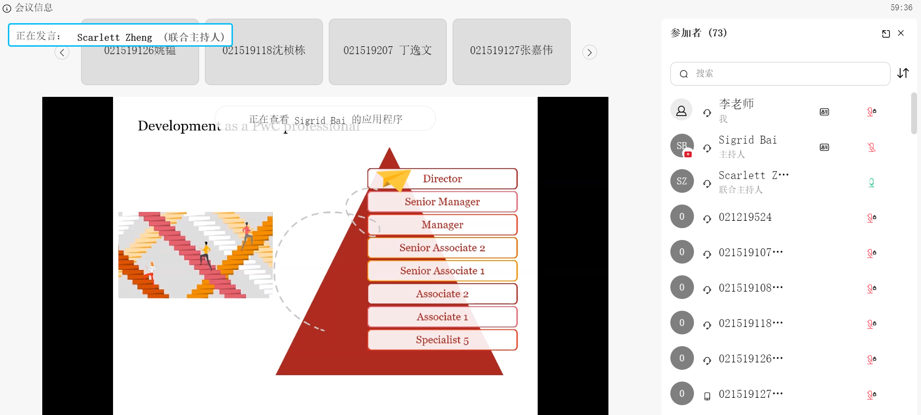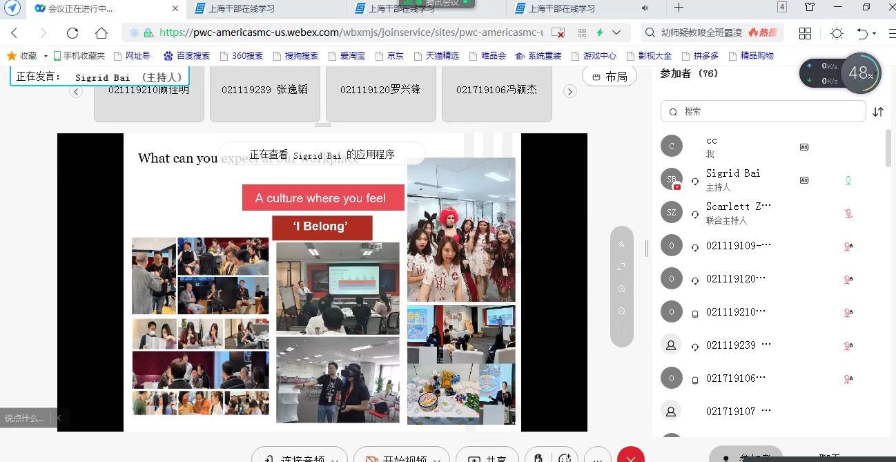 首先由会议主持人Jhon Xu简单介绍了会议的流程,之后为普华永道公司做了整体的介绍,。然后由Miss Zhang从形象品牌,国际化平台,职场生涯,福利待遇,企业文化等方面介绍了选择普华永道的优势。紧接着由SigridBai详细解释了本次招聘的对象为技术类实习生,功能类实习生,职能类实习生三个方向,以及各个方面的优势,比如导师制项目,全方位的专业和技能提升,参与全球知名信息技术咨询项目等,鼓励同学们加入普华永道。其次,Digtal Team的Lily就普华永道信息技术的计算机相关职业进行了讲解,对于实习期间,互联网产品的需求方向,框架方向,测试方向等任务进行了说明。最后,同学们进行了75分钟的笔试环节,如果笔试通过,就能够参加之后的面试。