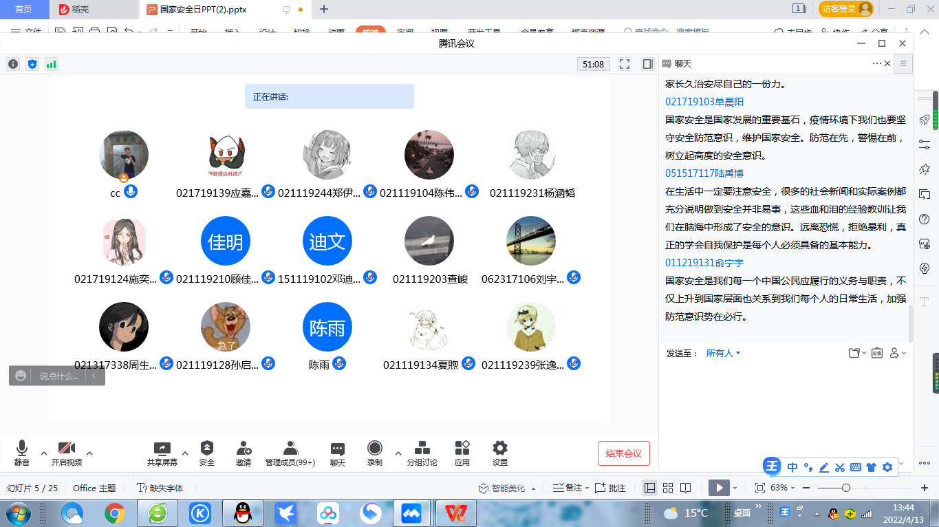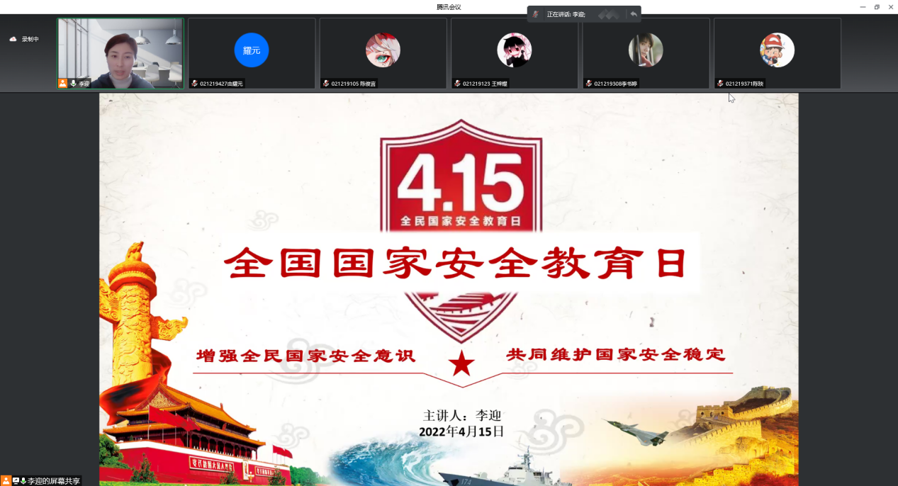 2022年4月13日,3044永利集团2019级以主题班会形式开展了国家安全宣传教育,辅导员江文超老师和李迎老师,从国家安全日的概念、背景、具体内容、公民的义务以及日常警惕活动和抵制措施等几个方面进行了讲解,同学们通过讨论也深刻明白了国家安全的重要意义与自己的义务。刘哲豪同学感悟到:“国家安全,匹夫有责,作为国家的一分子我们要时刻准备贡献自己的力量,维护国家安全”。