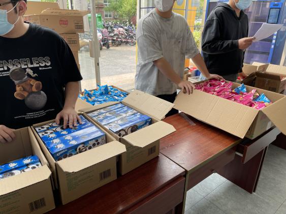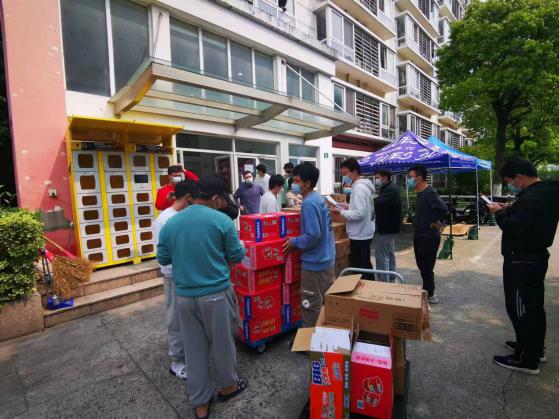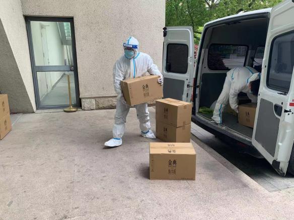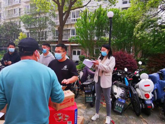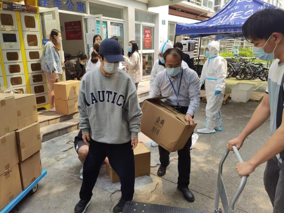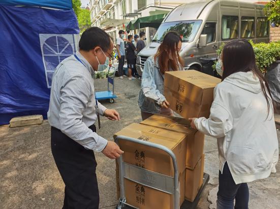 4月19日上午,方志军经理、刘瑾副经理带领院内值守一线的老师们,将消杀后的物资送达六期员工公寓,亲切慰问了公司住在六期的287位研究生。物资一箱箱、一件件被公司老师卸货消杀、装货转运、再卸货分发,原本站在三尺讲台教书育人的老师们,此刻都化身“配送员”、“快递员”,及时将物资送达员工宿舍,也将浓浓师生情刻进员工心里。