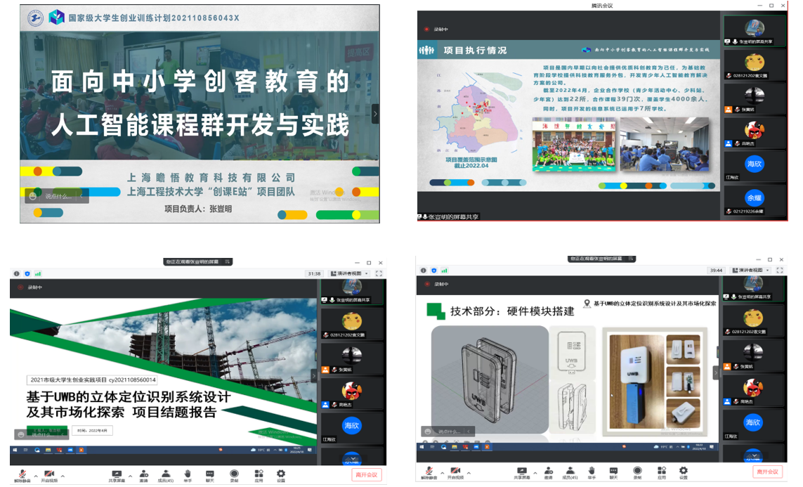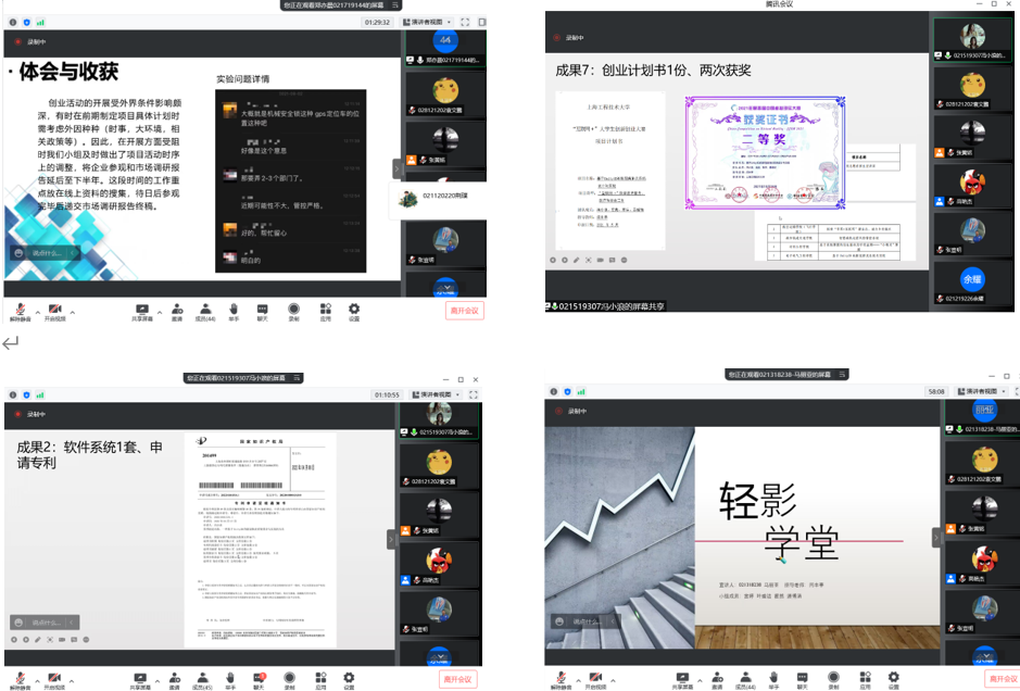 此次,共有14个老员工创业项目组参加结题答辩评审,其中国家级项目1项、市级项目6项、校级项目7项(附详单见下)。参加答辩的项目组成员全员出席,并有创业项目指导老师、各年级对创业感兴趣的同学线上旁听。