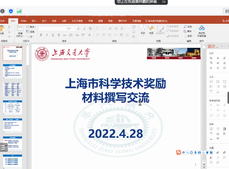 4月28日,公司线上组织召开2022年科学技术奖申报交流会,邀请到上海交通大学黄林鹏教授作报告并指导,公司2022年以及近几年有申报计划的教师参加,会议由刘瑾副经理主持。