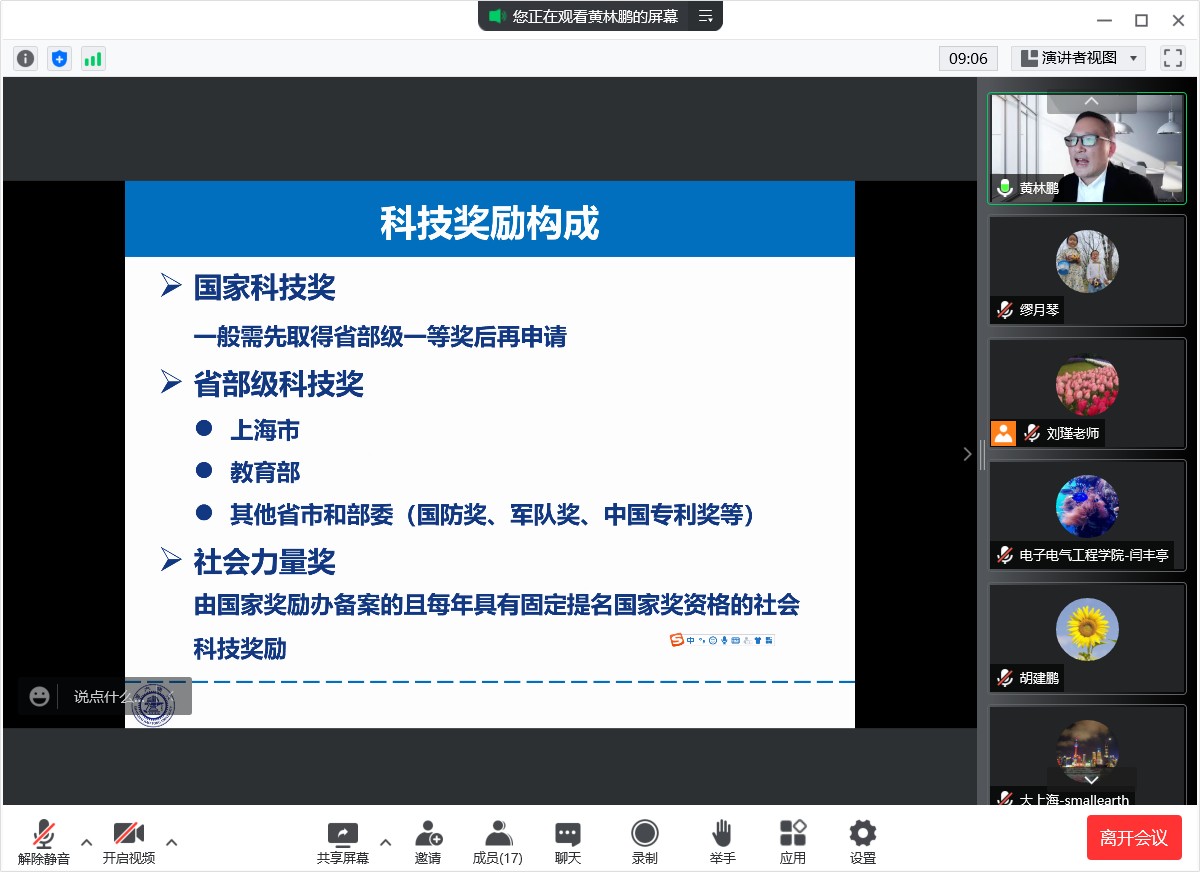 黄教授首先从科技奖励构成开始介绍科学技术奖报奖规则并分析报奖难易程度,然后讲解上海市奖近几年的主要改革举措,最后提出撰写具体建议。