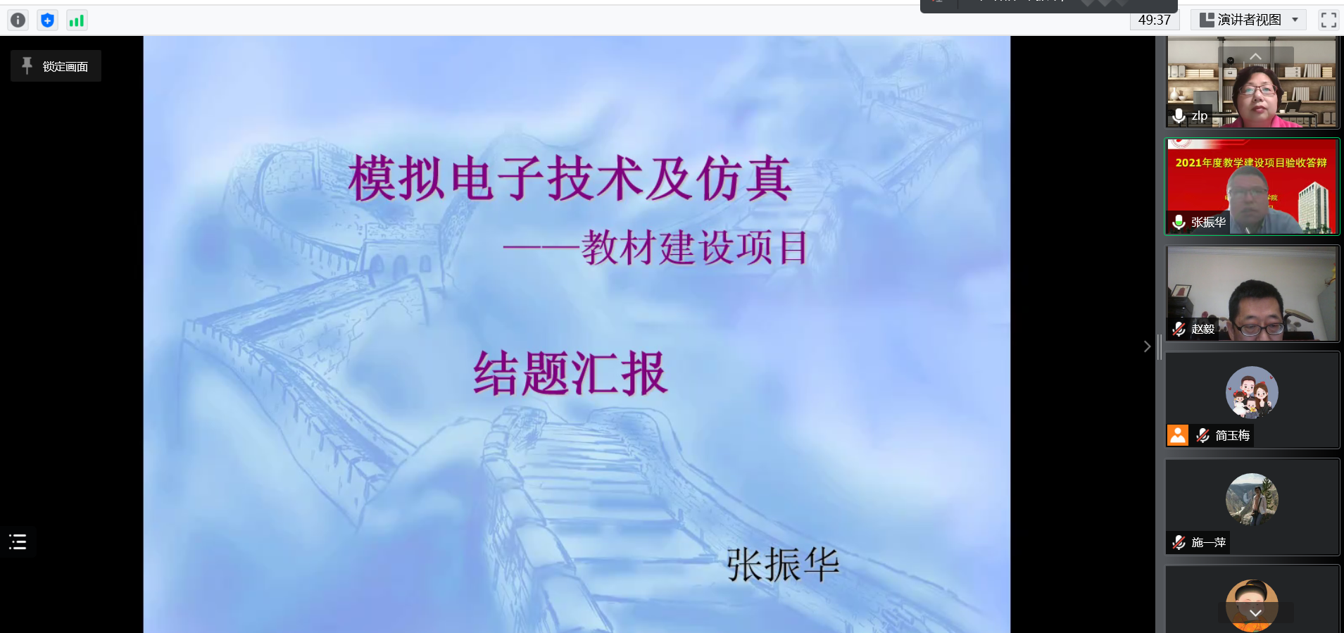 持续推进教学建设工作是提升教师教学和教育水平的有效举措。为保障项目建设质量,公司于2022年5月1日下午13:00,召开了线上教学建设项目验收评审会,会议邀请了东华大学李德敏教授、刘晓强教授以及公司张莉萍教授担任评审专家。校院两级教学建设项目负责人参加了此次会议,会议由公司教学副经理王晓军主持。