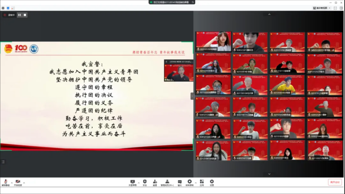 入团誓词是所有共青团员的初心所在,座谈会上,团委副书记梅是菲带领全体与会青年重温入团誓词。回望百年路,青春正当时。入团誓词是对前行者的致敬,是对红色基因的传承,也是所有青年团员对共青团最长情的告白。铮铮誓言激发了团员们入团时的那份赤忱与热情,重燃起他们艰苦奋斗、追求上进的激情。