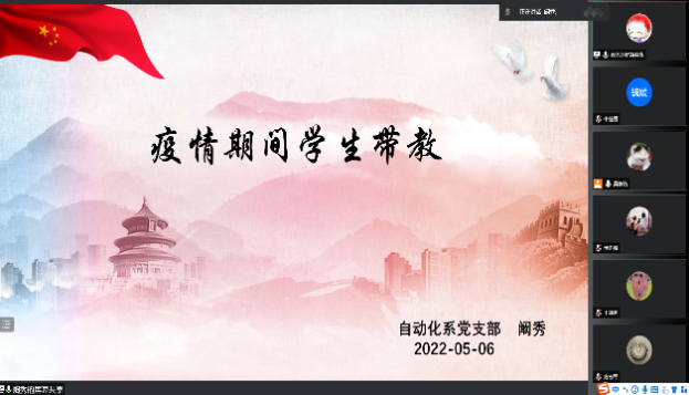 2022年5月6日,自动化系党支部通过线上腾讯会议平台开展了以“坚定必胜信心,全力打赢大上海保卫战”为主题的党日活动。会议由自动化系党支部书记奚峥皓老师主持,经理方志军同志、化工公司高分子材料与工程专业员工党支部王新燕老师和自动化系党支部全体党员参加了本次会议。
