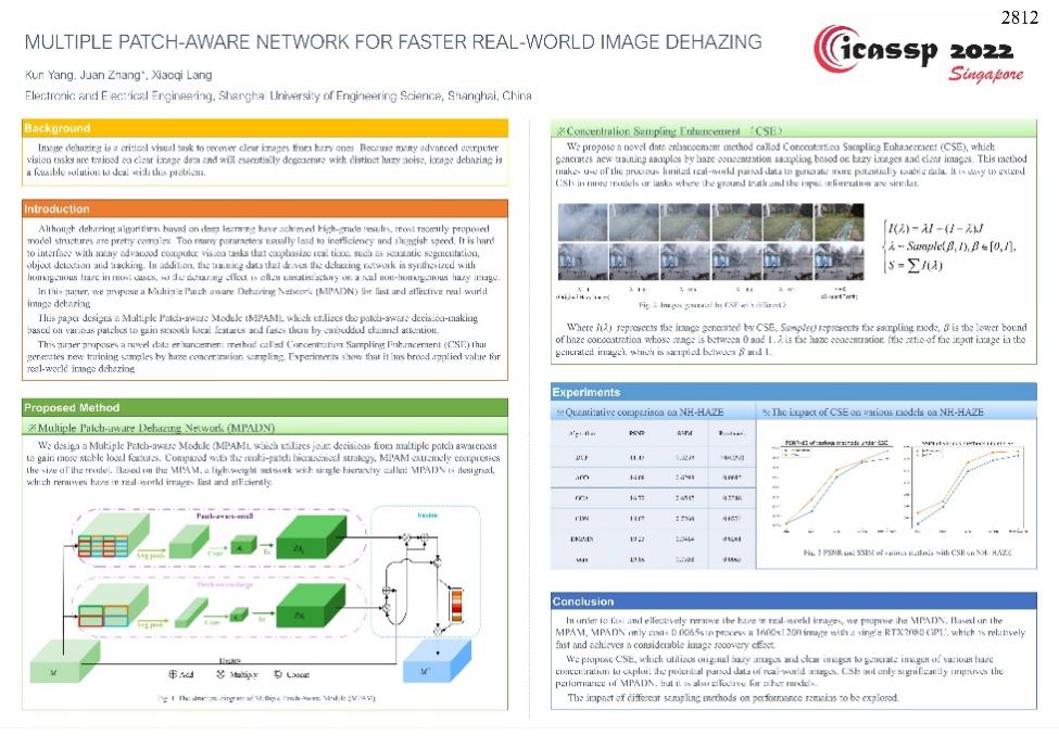 2022年5月7日至13日,ICASSP 2022(IEEE International Conference on Acoustics, Speech and Signal Processing)线上虚拟会议如期进行。公司教师张娟副教授指导研究生杨坤的研究论文(“Multiple Patch-aware Network For Faster Real-world Image Dehazing”,Kun Yang,Juan Zhang*,Xiaoqi Lang)被ICASSP 2022录用并进行了展示。