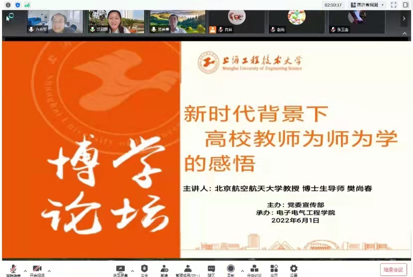 为推进“师德师风建设深化年”的工作要求,进一步加强党对公司教师工作的领导,夯实教师思想政治和师德师风建设工作基础,落实师德师风第一标准,6月1日下午,公司教师发展分中心在线上开展师德师风教育,特邀北京市教学名师、北京航空航天大学教授樊尚春做客公司博学论坛,给全体教职工作题为《新时代背景下高校教师为师为学的感悟》专题报告。公司全体教师和部分其他公司教师参加了会议。会议由公司党委书记范君晖主持。
