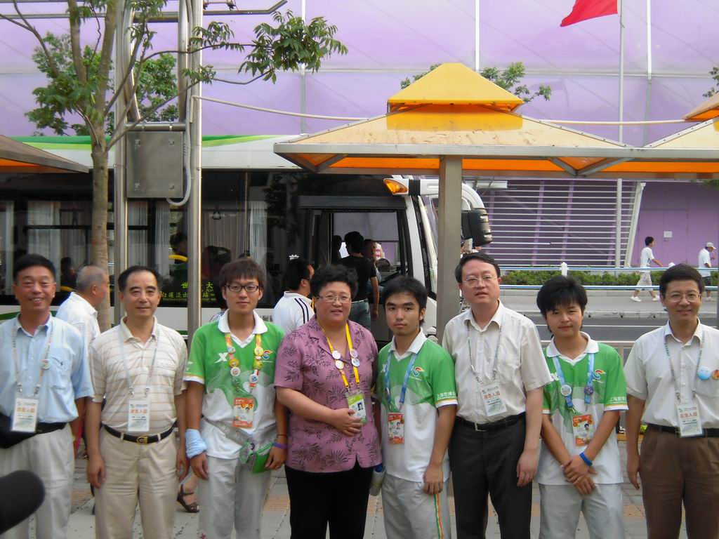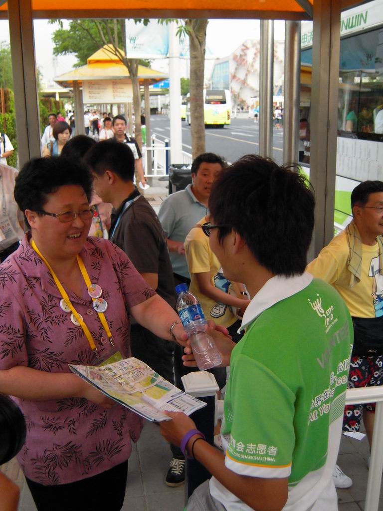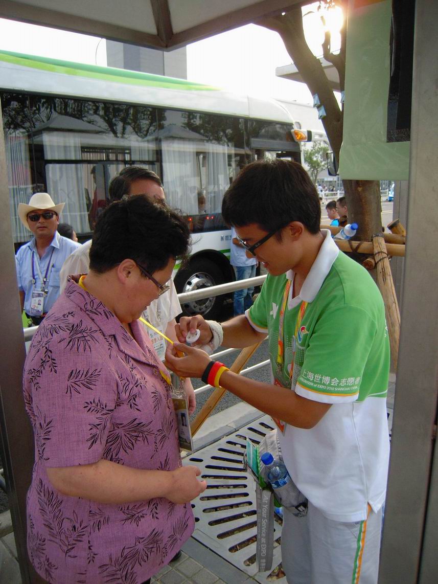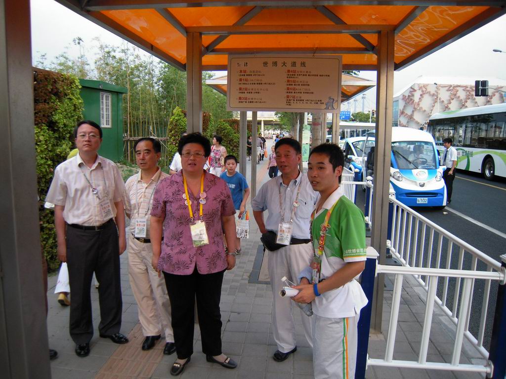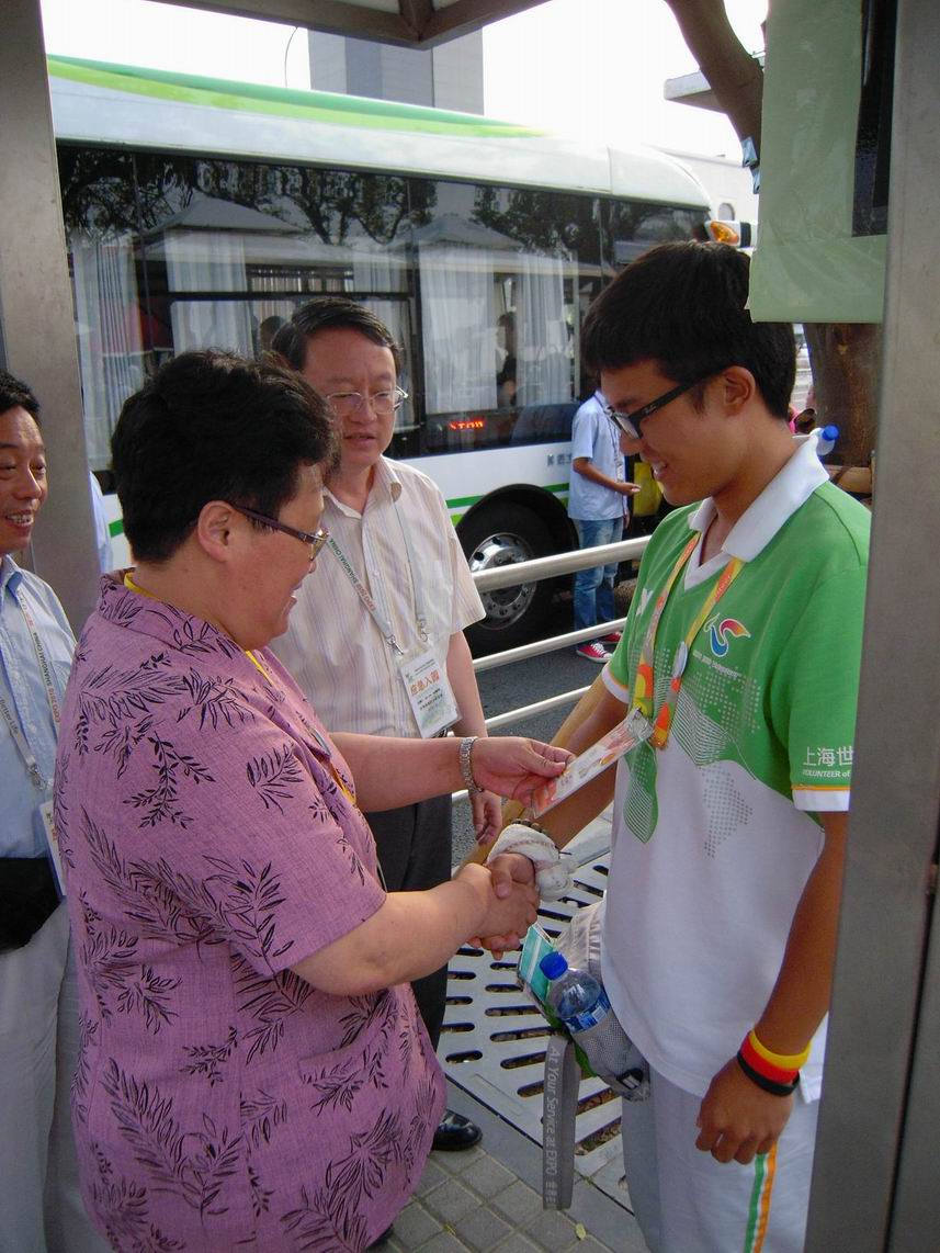 校领导先后来到世博园高科西路、博成路口和白莲泾路交通站点,为公司程程们送去了矿泉水等慰问品。汪董事长亲切地对小白菜们说:“同学们,辛苦了!”,让同学们倍受感动。在这连续的高温天,汪董事长十分关心大家晚间回校后的睡眠质量,希望大家要注意防暑降温,努力奉献世博的同时也要保重身体。电气程程王淼说:“感谢公司为大家开放空调房住宿,给我们带来夏日里的清凉,更让我们保证了足够的睡眠时间,第二天精神焕发地来世博园服务”。慰问至博成路口岗点时,汪董事长询问正在工作的陶烨君同学累不累,他激动万分的摇摇头:“汪董事长,我们不累,我们一定为校争光,圆满完成志愿服务。”走访间,汪董事长对电气公司员工设计制作的“小白菜”职务贴纸和个性徽章产生了浓厚的兴趣,电气“小白菜”争相将自己身上佩戴的“电气程程”和七个明星志愿者徽章赠送给校领导,而汪董事长则回赠公司限量版的金色校徽以资鼓励。人来人往的公交站台上,电气程程与校领导在工作岗点前合影留念。