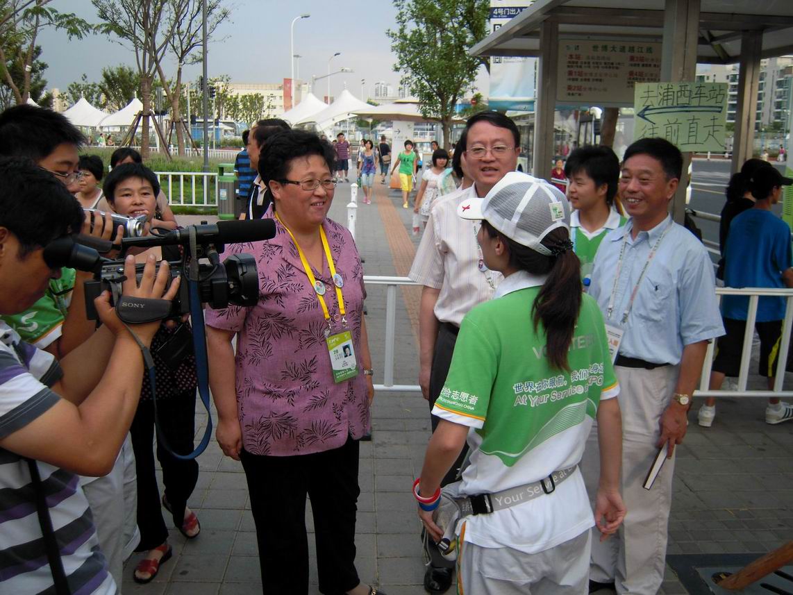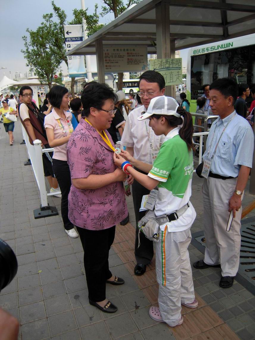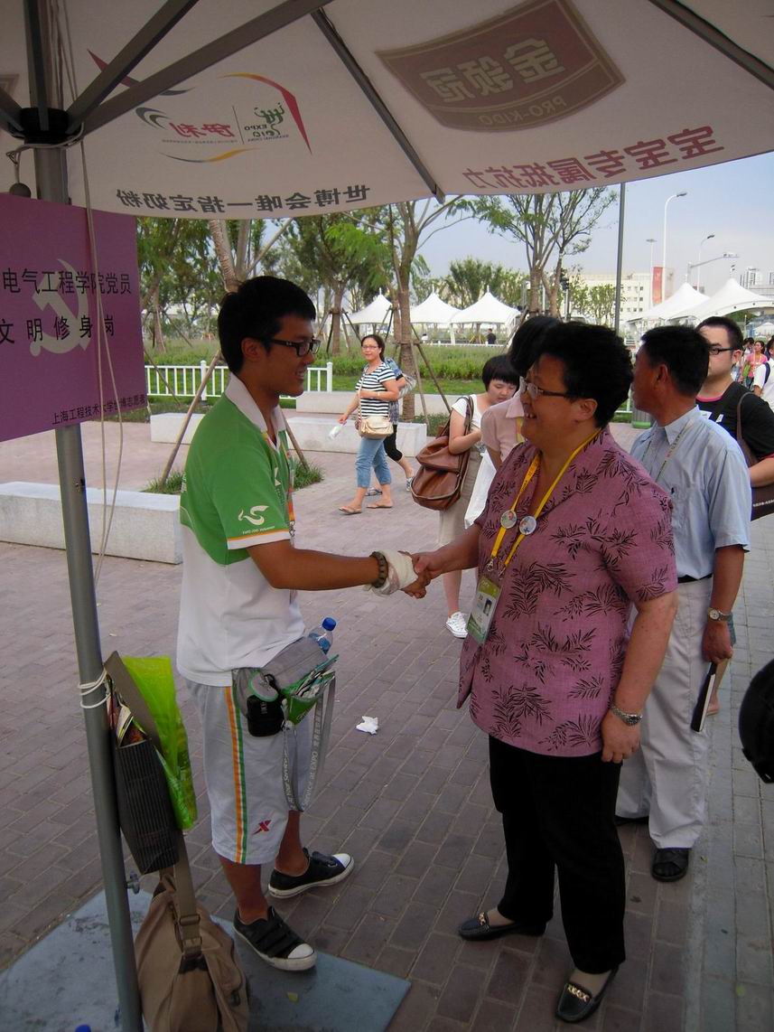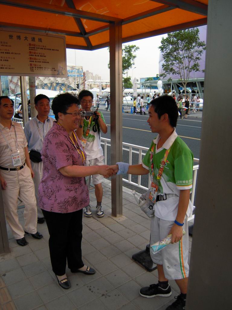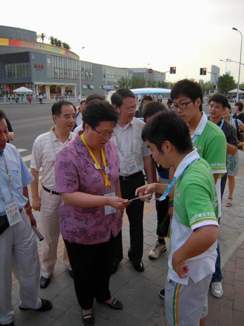 8月16日下午,董事长汪泓,副董事长郝建平、孙培雷、陈力华、程维明,公司党委宣传部部长王一川,员工部(处)长王明复,校办主任史健勇在校团委书记茅华伟和各公司分团委书记的陪同下进入世博园区慰问公司志愿者。傍晚5:15,董事长汪泓等校领导在A09、A10片区,慰问3044永利集团程程,使小白菜们深受鼓舞。